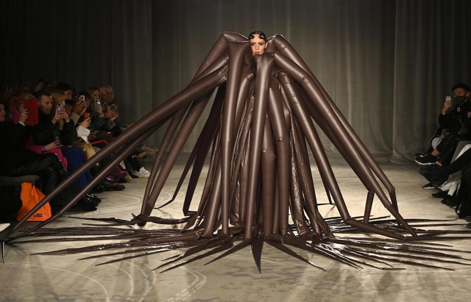 La cabeza de otra modelo apenas se asomó de su atuendo marrón con forma de araña con docenas de piernas durante la Semana de la Moda de Londres.