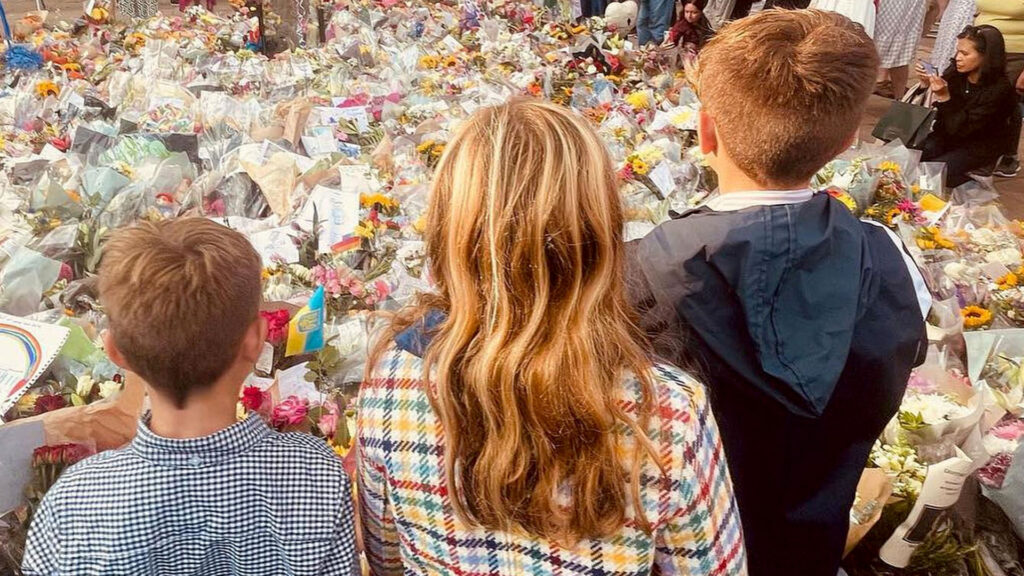 Capturó a su trío mirando pensativamente los cientos de ofrendas florales que quedaban fuera del palacio antes de capturar a su única hija, Bella, colocando una tarjeta en un ramo.