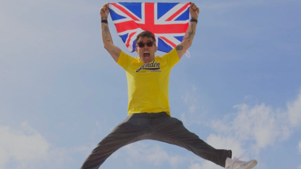 También se puso un sombrero de pescador Union Jack, llevó un paraguas cubierto con una bandera y agitó una bandera alrededor.