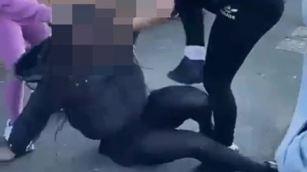 Imágenes impactantes mostraron a una multitud de niños blancos pateando, golpeando y arrancando las coletas de una colegiala negra en Ashford, Surrey.