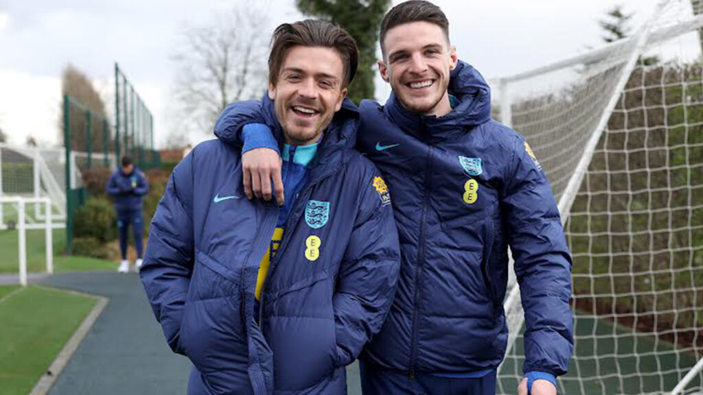Declan Rice y Jack Grealish lo hicieron mejor cuando se dirigían al entrenamiento con un aparato ortopédico sonriente, con el mediocampista del West Ham rodeando con su brazo al extremo del Manchester City.