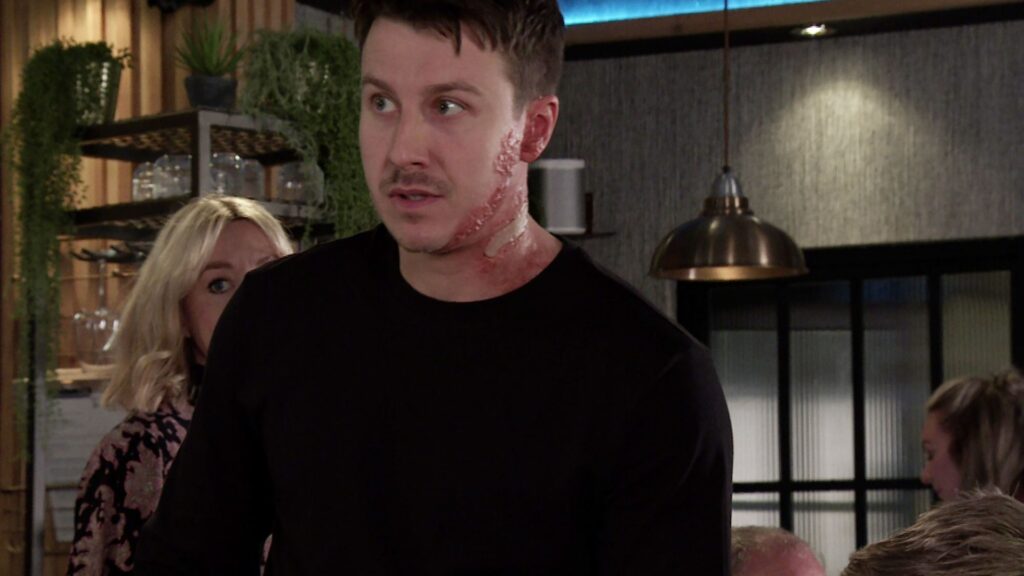 El camarero, que es interpretado por el actor Ryan Prescott en la telenovela ITV, volvió a trabajar esta noche justo a tiempo para la fiesta de cumpleaños de un niño.