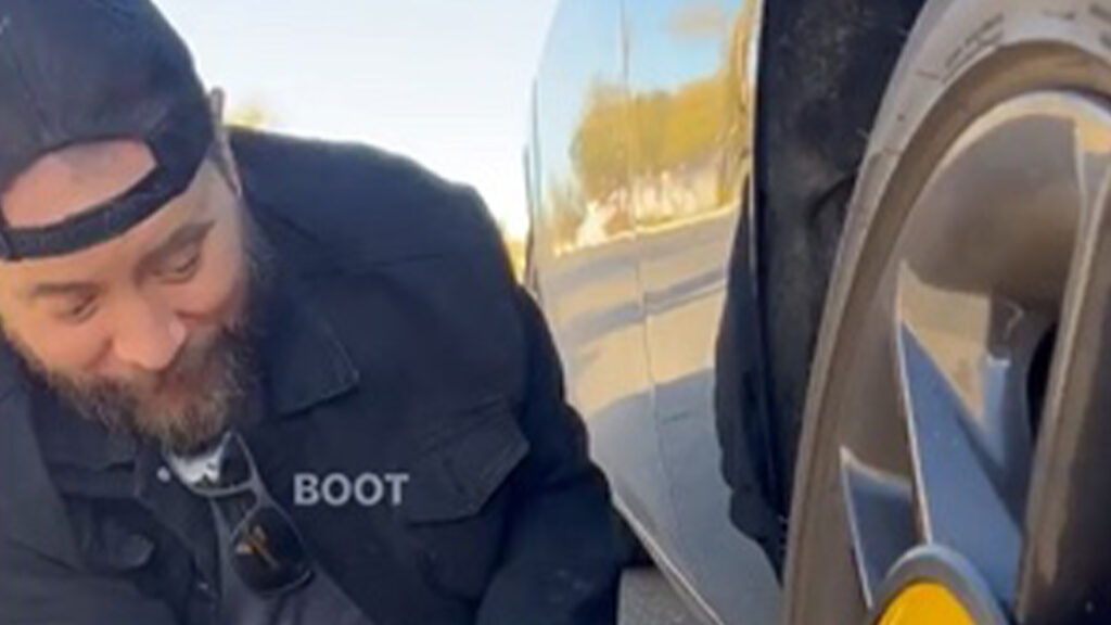 El video muestra al hombre quitando la abrazadera de su automóvil.