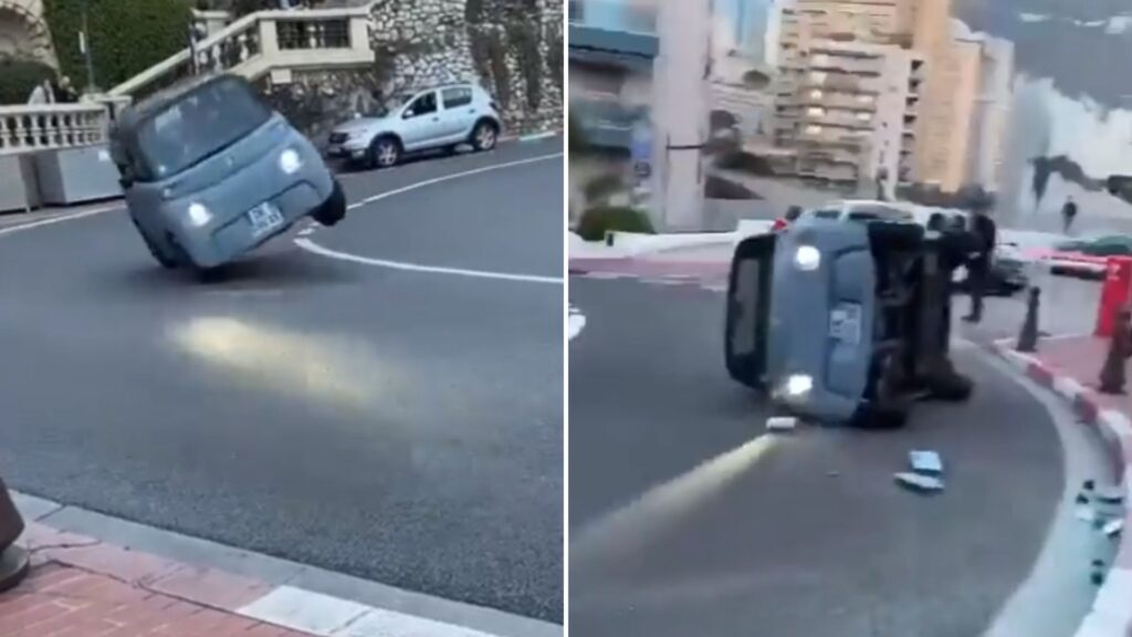 Las imágenes muestran el pequeño automóvil urbano eléctrico cuadrado, un Citroën Ami azul, que intenta conducir alrededor del Grand Hotel Hairpin en Mónaco.