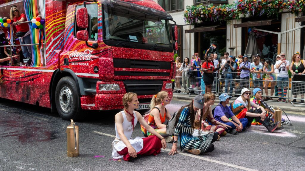 Momento Just Stop Oil eco yob pegs delante del camión de Coca-Cola durante el Orgullo Gay en Londres