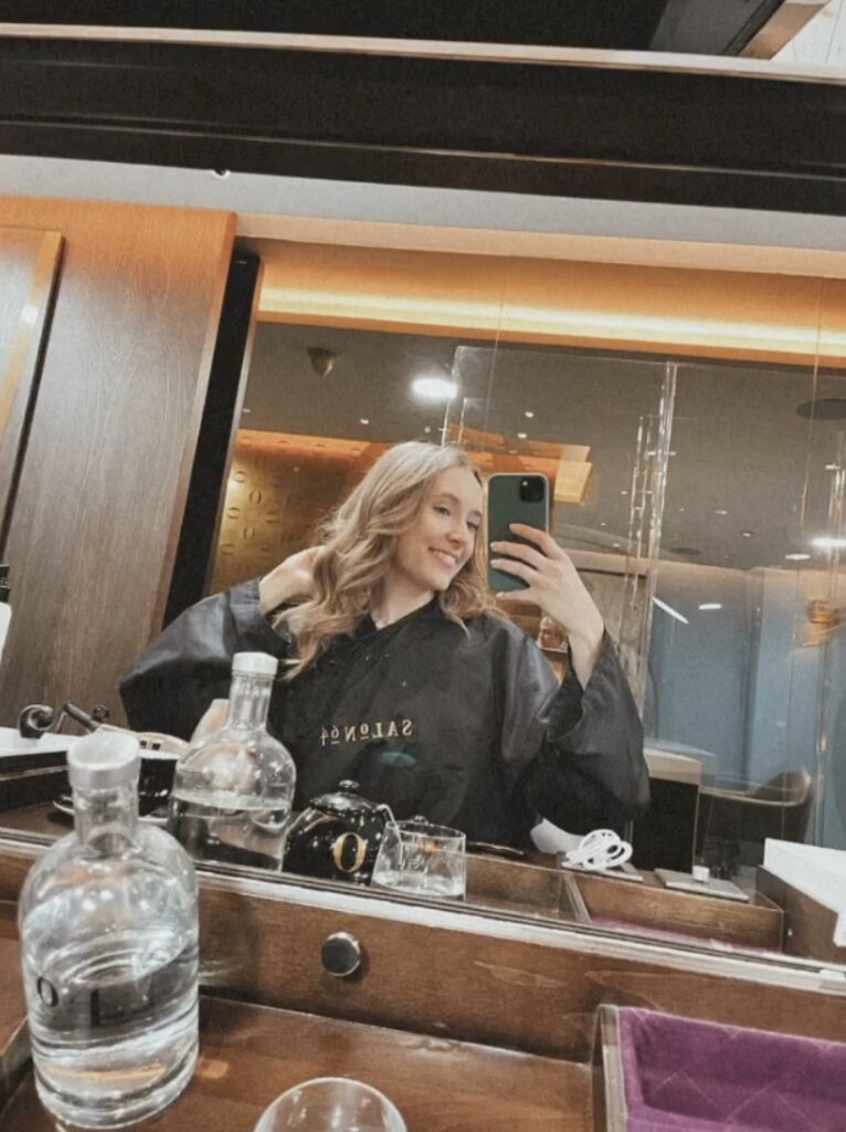 Posando para una selfie en el espejo del salón de belleza favorito de las celebridades, sonrió mientras hacía alarde del corte nuevo y ondulado.