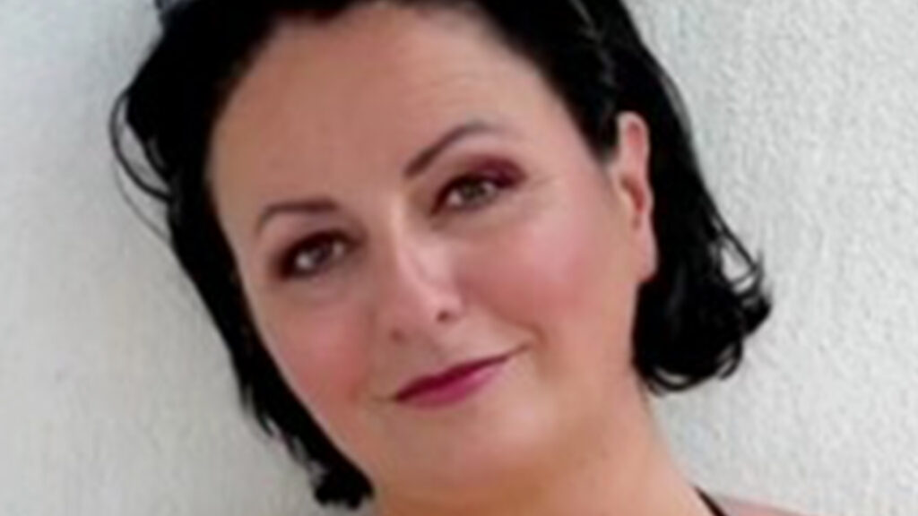 Gafas de sol echadas hacia atrás, uñas pintadas de rojo, sus manos descansan sobre sus caderas mientras mira directamente a la lente de la cámara.